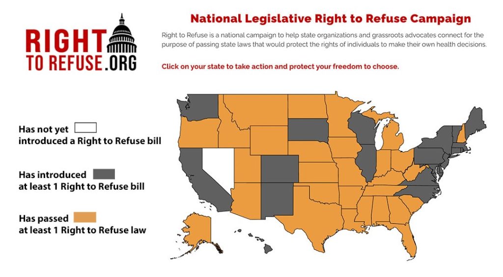 Inspired by the “COVID regime” of mandates and mandatory masking, in December 2020 the Right to Refuse project was born. This project is a national campaign to help you pass laws in your state to protect your health and medical freedom.